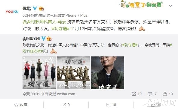 开播时间方面,《功守道》将于在今天的双十一晚会上放出精华版;11月12日零点优酷独播。