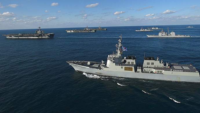 美国海军在东亚同时集结三个航母战斗群,以往罕见,广受关注。美国本来想组织一场美日韩三国联演,但因为韩国不同意与日本联合,因而只好改为美韩联演和美日联演两场演习。