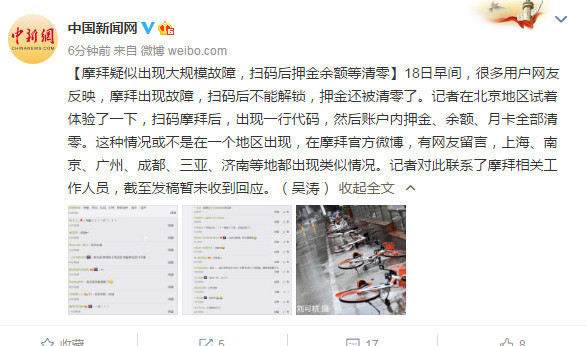 18日早间,很多用户网友反映,摩拜出现故障,扫码后不能解锁,押金还被清零了。记者在北京地区试着体验了一下,扫码摩拜后,出现一行代码,然后账户内押金、余额、月卡全部清零。这种情况或不是在一个地区出现,在摩拜官方微博,有网友留言,上海、南京、广州、成都、三亚、济南等地都出现类似情况。记者对此联系了摩拜相关工作人员,截至发稿暂未收到回应。